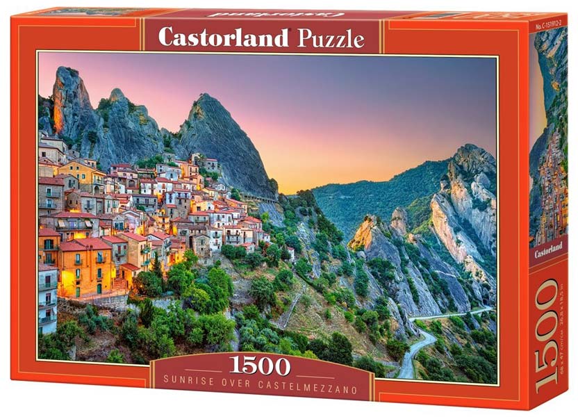 Ett 1500 bitars pussel från Castorland med med ett motiv från en solupgång över Castelmezzano i Italien.